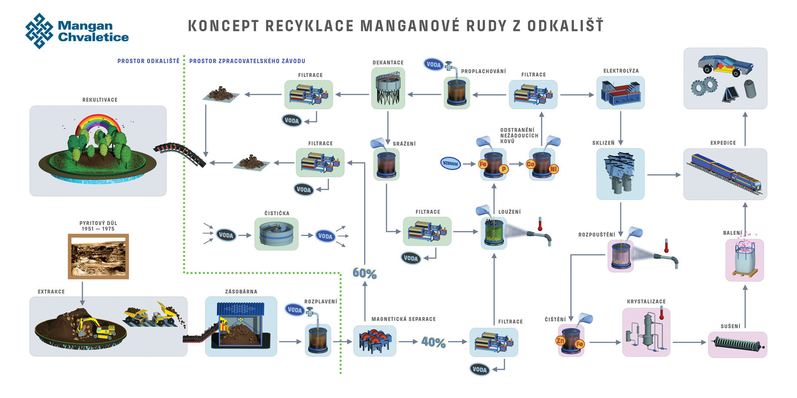 Působením intenzivního magnetického pole dojde ke zkoncentrování sloučenin manganu. Výsledkem bude podíl obohacené hlušiny s obsahem manganu přibližně 15 % a nemagnetický podíl s minimálním zbytkovým obsahem manganu. Koncentrát hlušiny následně projde loužením – v uzavřených a centrálně odvětrávaných loužicích tancích po přidání kyseliny sírové. Plyny z procesu budou kontinuálně vypírány v zařízení na čištění průmyslových plynů vodní sprchou. Voda bude upravována v cirkulační čističce průmyslového vodního okruhu a po vyčištění znovu použita.